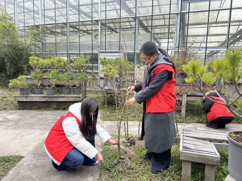 活动伊始,志愿者们在老师的带领下集合,明确分工与安全规范后,开启了一场“植物认知+养护实践”的自然之旅。志愿者们一边聆听植物生长习性与生态价值的讲解,一边拿起工具投入劳作:为苗圃松土除草、疏通根系,为绿植精准浇灌、补充养分,还在空白区域栽种新苗,培土、固定、浇水一气呵成,汗水浇灌绿意,让原本略显杂乱的苗圃区域焕然一新。劳作之余,志愿者们还化身环保宣传员,亲手制作生态标识牌,标注植物名称与固碳价值,让低碳环保理念可视化、可感知。活动尾声,志愿者们主动清理现场杂物、规整工具,以细节践行“无痕环保”绿色理念。